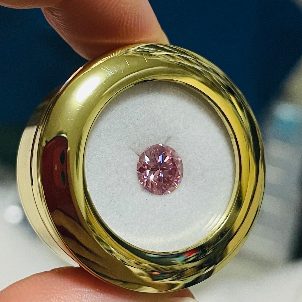 Displaying a delicate Sakura pink hue with VVS1 clarity, this moissanite offers eye clean transparency and refined sparkle. The round cut enhances balanced brilliance, while the hearts and arrows pattern reflects master level craftsmanship that elevates the stone’s visual performance and luxury appeal.